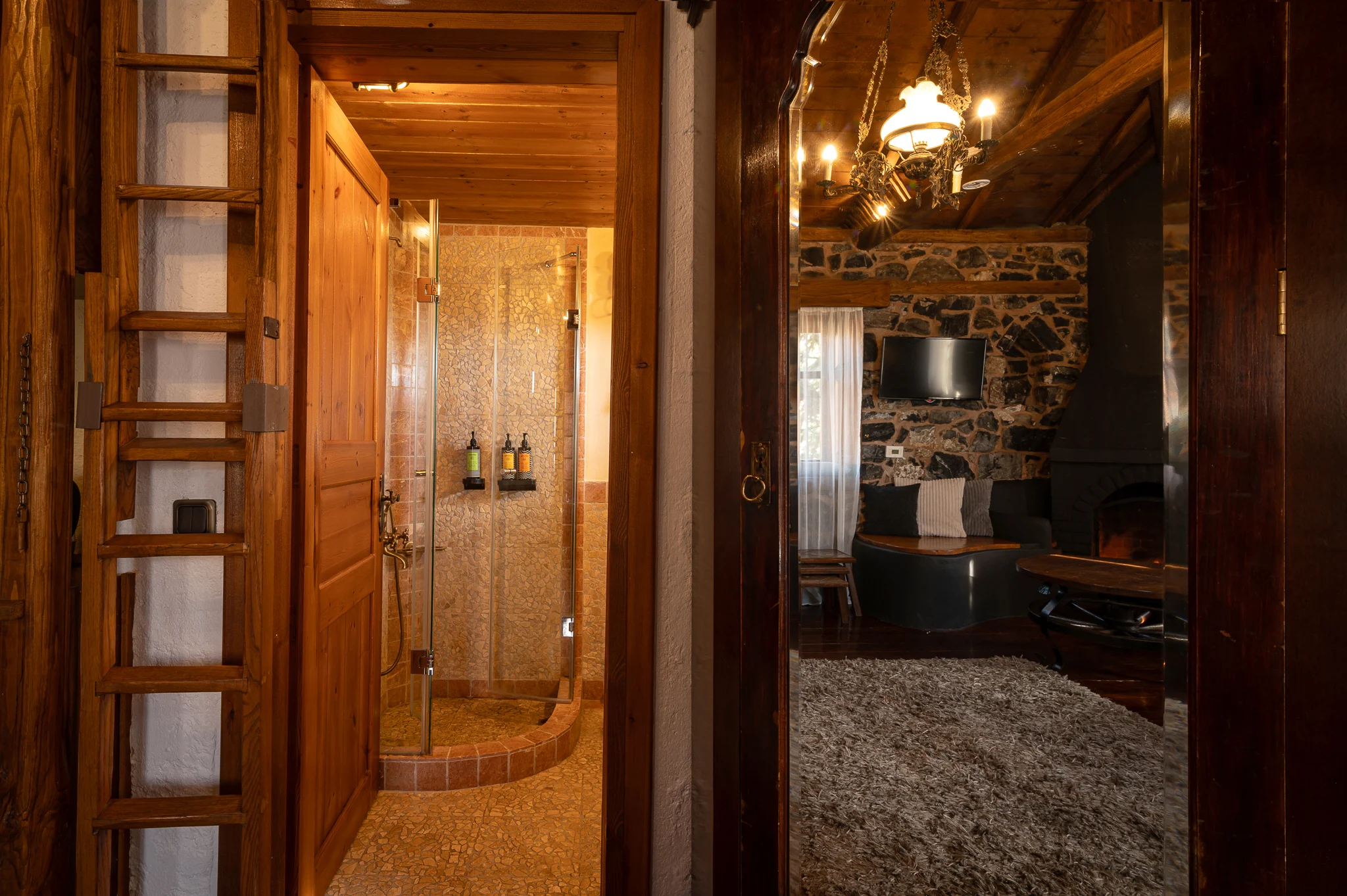 Η σουίτα (30 τ.μ.) διαθέτει ένα ευρύχωρο σαλόνι με τζάκι, πολυτελές king-size κρεβάτι με ανώστρωμα, και ένα σύγχρονο μπάνιο με ντουζιέρα καταρράκτη, διακοσμημένο με πέτρα, ξύλο και ψηφιδωτές λεπτομέρειες. Όλα τα προϊόντα περιποίησης είναι της APIVITA, ενώ τα λευκά είδη προέρχονται από την ελληνική εταιρεία Klotsotiras, διασφαλίζοντας υψηλή ποιότητα και άνεση.