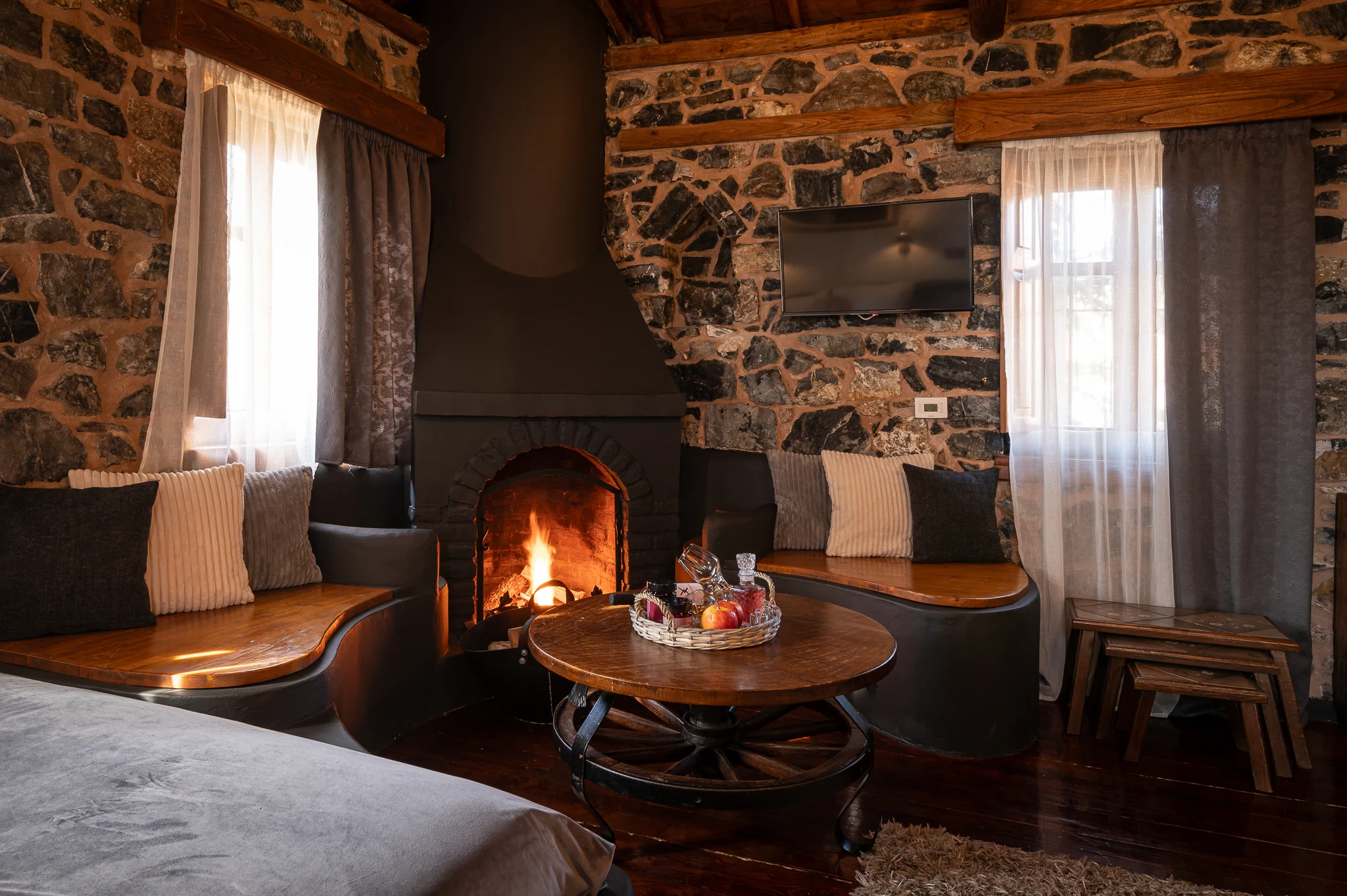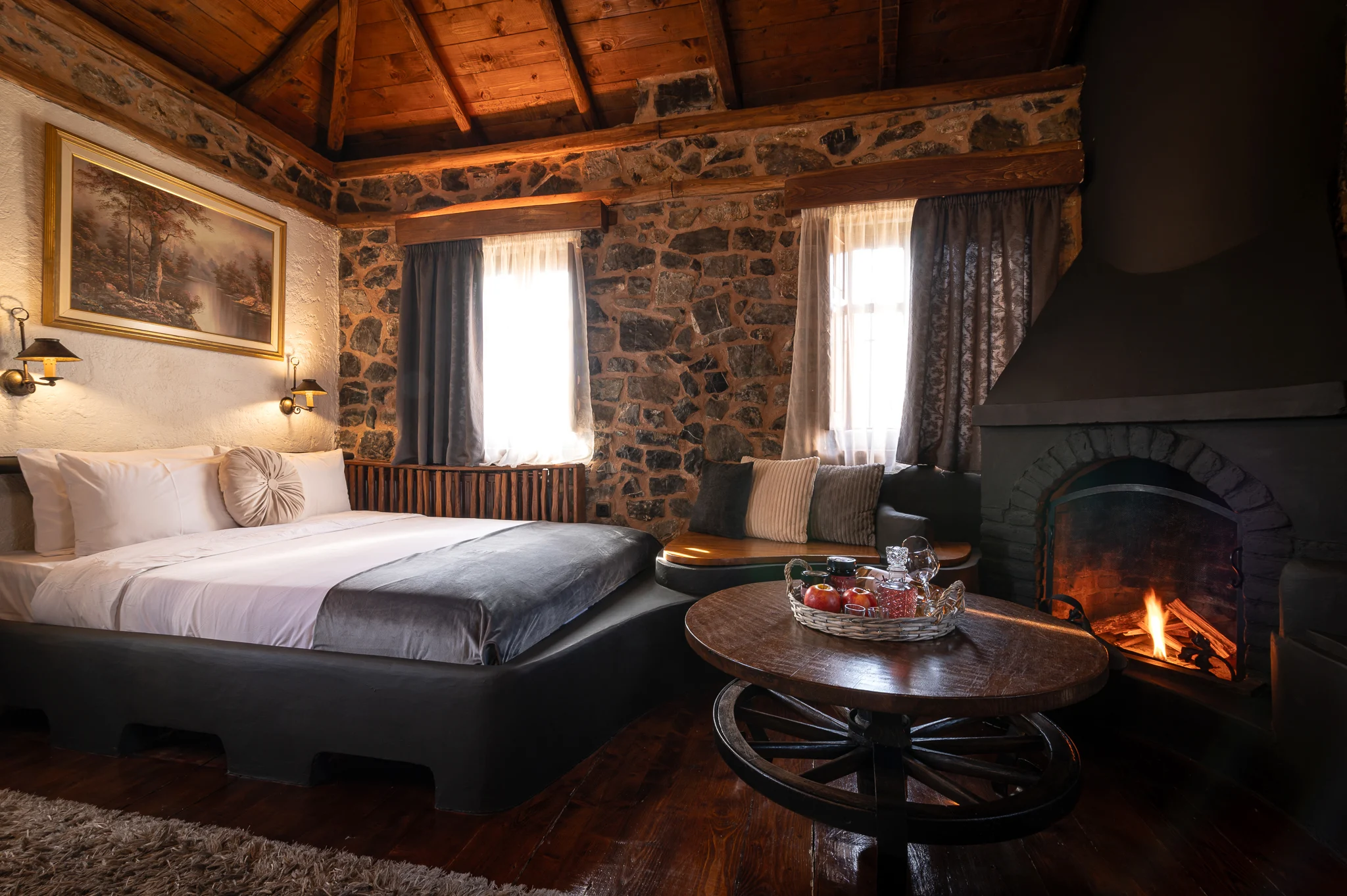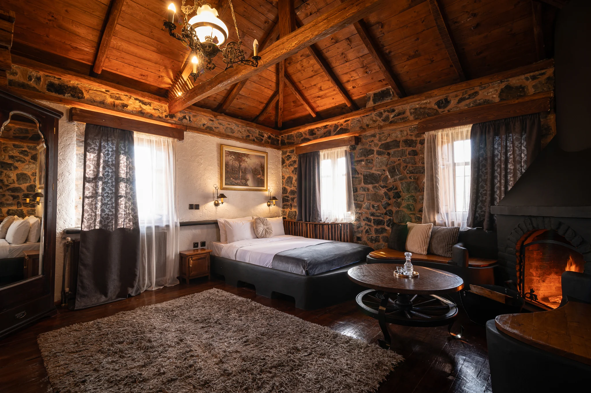 Το king size room είναι ένα ξεχωριστό καταφύγιο ηρεμίας, σχεδιασμένο για επισκέπτες που αναζητούν άνεση, ύφος και αυθεντικότητα. Με έμπνευση από το αλπικό τοπίο του Καϊμακτσαλάν, η διακόσμηση της σουίτας συνδυάζει την παραδοσιακή πέτρα, το ξύλο καρυδιάς και τα χειροποίητα έπιπλα, δημιουργώντας μια αίσθηση θαλπωρής και γοητείας.
