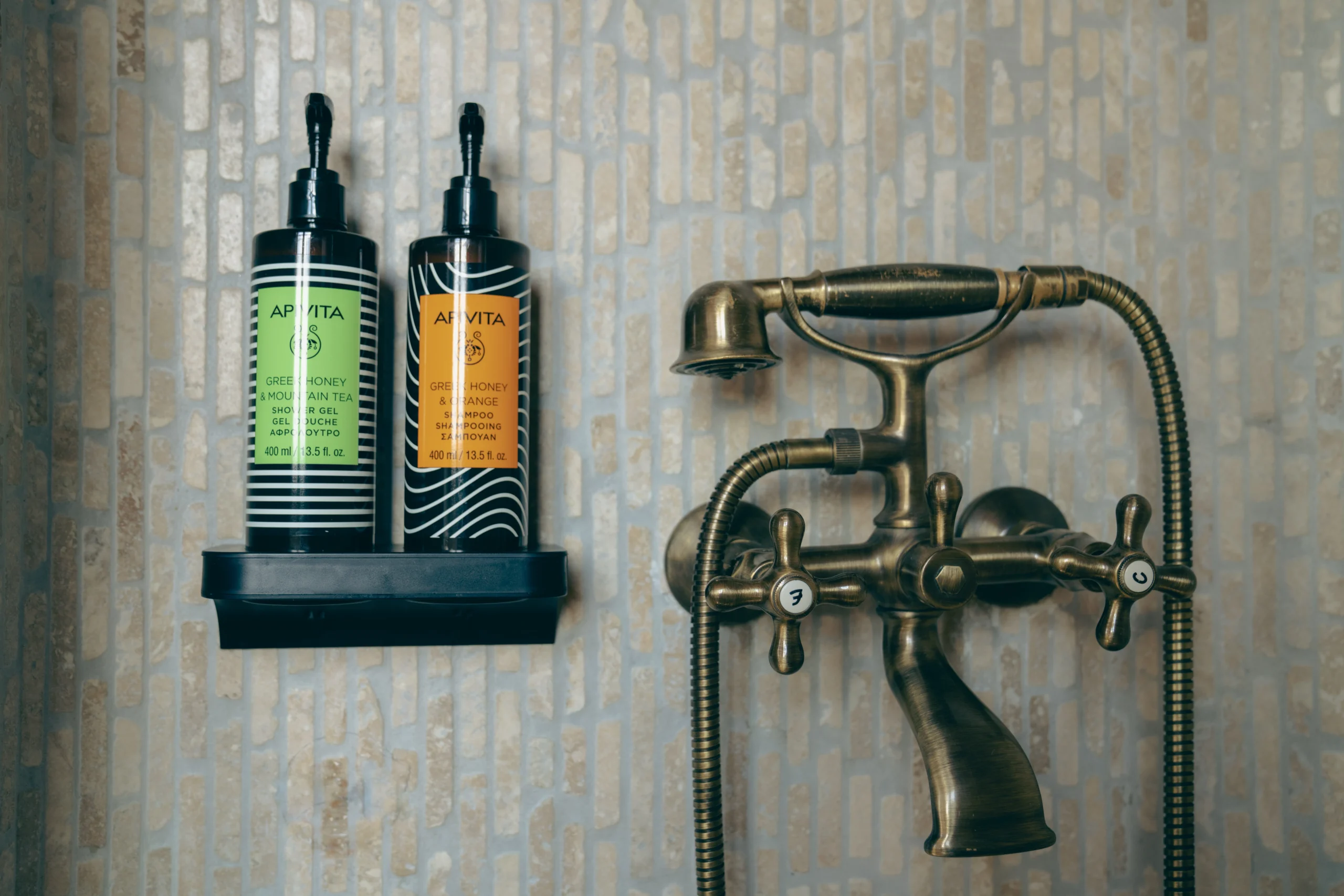 Το κύριο μπάνιο, επενδυμένο με ψηφιδωτά πλακάκια και φυσικά υλικά, διαθέτει ευρύχωρη καμπίνα ντους, ενώ το επιπλέον WC εξυπηρετεί ιδανικά οικογένειες ή μεγαλύτερες παρέες. Το μίνι μπαρ, τα προϊόντα περιποίησης APIVITA και τα λευκά είδη της Klotsotiras προσθέτουν μια διακριτική νότα πολυτέλειας στην παραμονή σας.